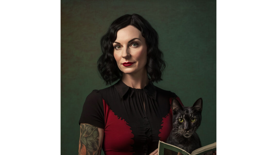 Adelaide Farr is a Caucasian woman in her early 40s with shoulder-length black hair and dark green eyes. She is wearing a black and red shirt and holds a tattered book in her hands. She's looking straight at the viewer, with a small smile. She has a large tattoo of leaves on her upper right arm. She's also holding a black cat with green eyes.