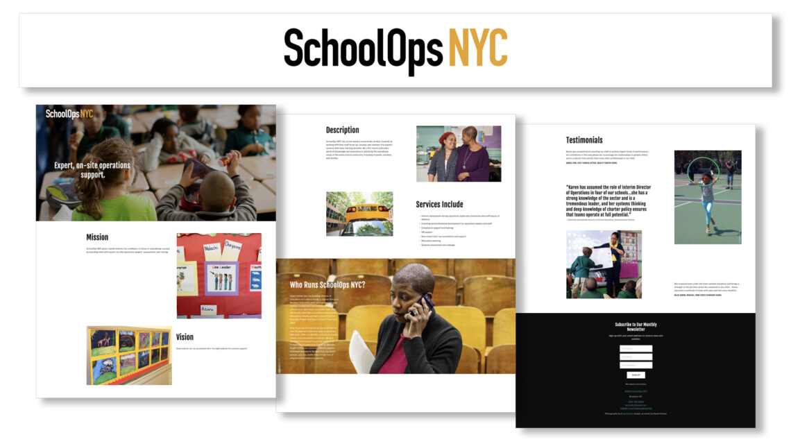 To keep things simple, we decided on a one-page website with several different sections. Using the Squarespace platform, I used stock and custom photos to give the feel of exuberant classrooms and a well-functioning school, and Karen supplied me with carefully honed copy. Testimonials, a contact form and a newsletter signup link rounded out the site.